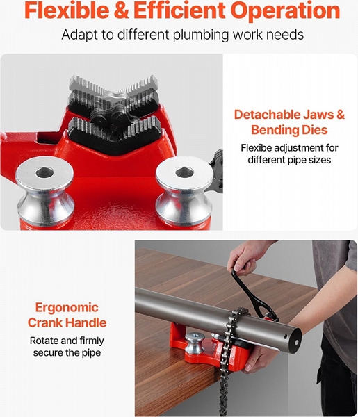 - Гибкость в эксплуатации: благодаря съемным V-образным зубчатым губкам и гибочным роликам подходят для различных сантехнических работ, эргономичная кривошипная рукоятка обеспечивает точный контроль натяжения цепи, значительно повышая эффективность работы
